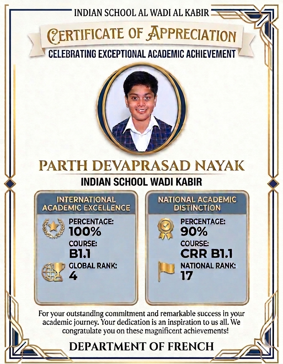 It began to take its present shape in 1987 as Indian School Muttrah, with English as the medium of instruction. It was named Indian School AL Wadi Al Kabir because of its location when it moved into its new premises in September 1993.