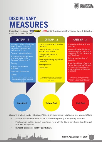 Students will be issued BLUE YELLOW or RED card if found deviating from School Rules & Regulations