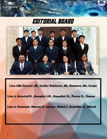 EDITORIAL BOARD Line 1:Mr.Gerard ,Ms. Jenifer Robinson ,Ms. Ranjana ,Ms. Sreeja Line 2: Aravind K. ,Anagha S.N. ,Gayathri H., Purva D., Shawn Line 3: Shamant ,Neerav K ,Jeevan ,Rahul S ,Ananthu K. ,Nihad 38